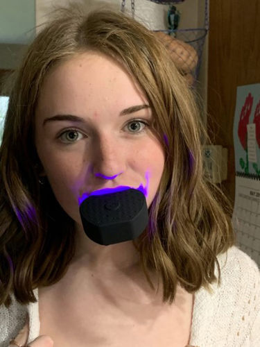 2. Gently insert the mouthpiece between your top and bottom jaws, positioning it comfortably for maximum cleaning power.